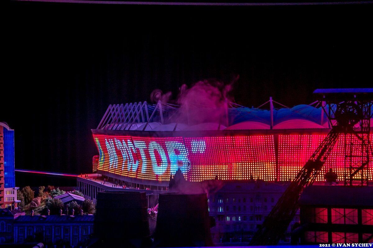 Как-то так получилось, что у этой серии обзоров в первых "выпусках" сложилась тенденция присутствия слово "железнодорожный". Долго думал, как это привязать к Ростову, вышло вот так, кривовато. Ах, да! Что за серия, спросит быть может, человек, зашедший непосредственно в этот обзор и не видевший предыдущих? Речь идет о городах, представленных на макете, который находится в Москве, неподалеку от станции метро ВДНХ и называется "Царь-макет". Ссылки на другие обзоры - в самом низу, а мы сегодня говорим о Ростове-на-Дону. 1. Самой масштабной, в смысле самой крупной моделью города на макете является стадион. Во время "ночи" он выглядит примерно так: 2. При этом на самом стадионе, который выполнен в разрезе, идет футбольный матч. 3. Рядом со стадионом (ростовчане, наверное такой "географии" сейчас ухмыльнулись, как ранее смеялись москвичи и петербуржцы) расположился Собор Рождества Пресвятой Богородицы и памятник перед ним, на макете не разглядел, но вроде бы похож на памятник Святителю Дмит
