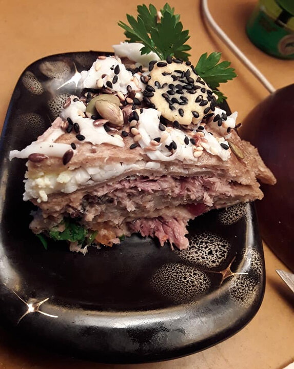 Сыр тёртый, сваренное вкрутую яйцо. 1 слой: блин смазала горчицей, майонез, рыбный фарш. 2 слой: блин, помидоры. 3 слой: сыр, яйцо, майонез. 4 блин: фарш рыбный. Сверху - последний блин, и украсила: тёртый белок, сыр, тыквенные семечки, кунжут белый и черный, семя льна (предварительно размоченные). А вишенка на торте быть должна непременно :) P.S. Вариант заправки для майонезоненавистников: йогурт нежирный + хрен + лимонный сок + зелень (петрушка, укропчик) + соль и перчик. Всем доброго здоровья! + 4 фото Больше общения и рецептов - в группе "Жизнь с диабетом" в Facebook и одноимённом Telegram