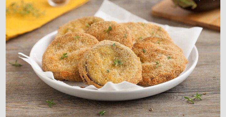 Ингредиенты: 2 баклажана среднего размера 2 яйца 60 г панировочных сухарей 30 г тертого сыра пармезан 50 г крупной соли соль перец арахисовое масло для жарки листья тимьяна для украшения Как приготовить: Для приготовления котлет из баклажанов необходимо сначала вымыть баклажаны и нарезать их ломтиками толщиной 1 см. Переложите их на дуршлаг и посыпьте каждый ломтик небольшим количеством крупной соли. Дайте стечь в течение 1 часа при комнатной температуре. По истечении этого времени хорошо вымойте их, чтобы удалить излишки соли. Затем высушите их на сковороде с антипригарным покрытием без масла, нагревая в течение нескольких минут с обеих сторон. Дайте им полностью остыть и приступайте к панировке. Пассировать сначала яйцо, взбитое с солью и перцем, а затем панировочные сухари, смешанные с тертым сыром Пармезан. Повторите операцию, чтобы получилась двойная панировка. Обжарьте баклажанные котлеты по несколько штук в большом количестве арахисового масла, чтобы они подрумянились с обеих