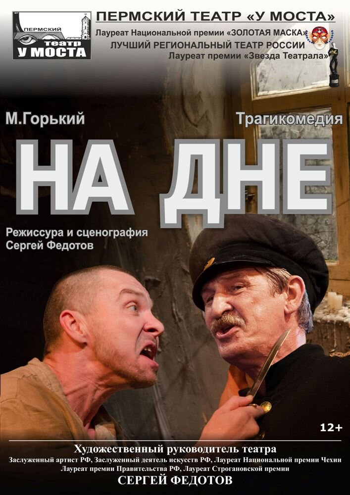 13 июня 2021 года, в 19:00 на сцене Новороссийского городского театра спектакль "На дне" Жанр: Трагикомедия Режиссура и сценография: Сергей Федотов Продолжительность спектакля: 2.50 с антрактом Максим Горький Первое потрясение от спектакля «У Моста» – это та самая ночлежка прошлого века, воспроизведённая Сергеем Федотовым с присущей ему тщательностью проработки мельчайших деталей. На сцене словно оживают старинные фотографии. Актёры не играют – они действительно живут на сцене, даже не живут, они священнодействуют, вовлекая зрителя в свое магическое пространство. Так играть умеют только артисты «У Моста». Их невероятная, тонкая игра с первых же минут погружает нас в атмосферу ночлежки начала ХХ века. Спектакль покоряет смелыми контрастами, экспрессией и, несмотря ни на что, вызывает светлые чувства. Ведь эти забытые Богом «бывшие люди» также верят в свою звезду, также балагурят, веселятся и радуются любой возможности счастья. Участие в фестивалях Российские: - «Волшебная кулиса», П