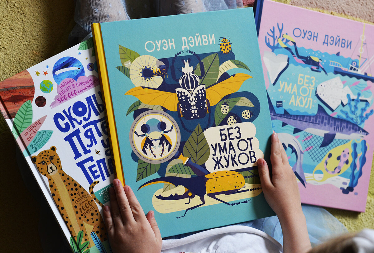 На днях я разбирала книги на даче. Знаете, такие завалы – дома не нужны, а выбросить жалко? И нашла несколько энциклопедий про динозавров. Дочка обожает доисторических рептилий, я села их с ней полистать: прекрасное качество, книгам всего то лет 20, яркие фотографии и… мелкий текст строго научного содержания. «Читать сейчас это бесполезно, смотри картинки» - мой ответ ребенку. Все хорошо, когда это по возрасту. Дочке сейчас 5,5 лет. Ее новая тема – исследования. Она ставит эксперименты и все подробно изучает. Энциклопедии для этого очень подходят. Но тут важно, чтобы информация в них была по возрасту. На дворе – лето, так что самое время изучать насекомых. Я для этого выбрала книгу издательства «Манн, Иванов и Фербер» и Оуэна Дэйви «Без ума от жуков». У нас уже была книга этого автора «Без ума от акул» и я знала, что от нее можно ждать. Формат чуть больше А4, твердый переплет, 36 страниц, офсетная бумага средней плотности, не очень много текста и яркий насыщенный иллюстрациями дизайн.
