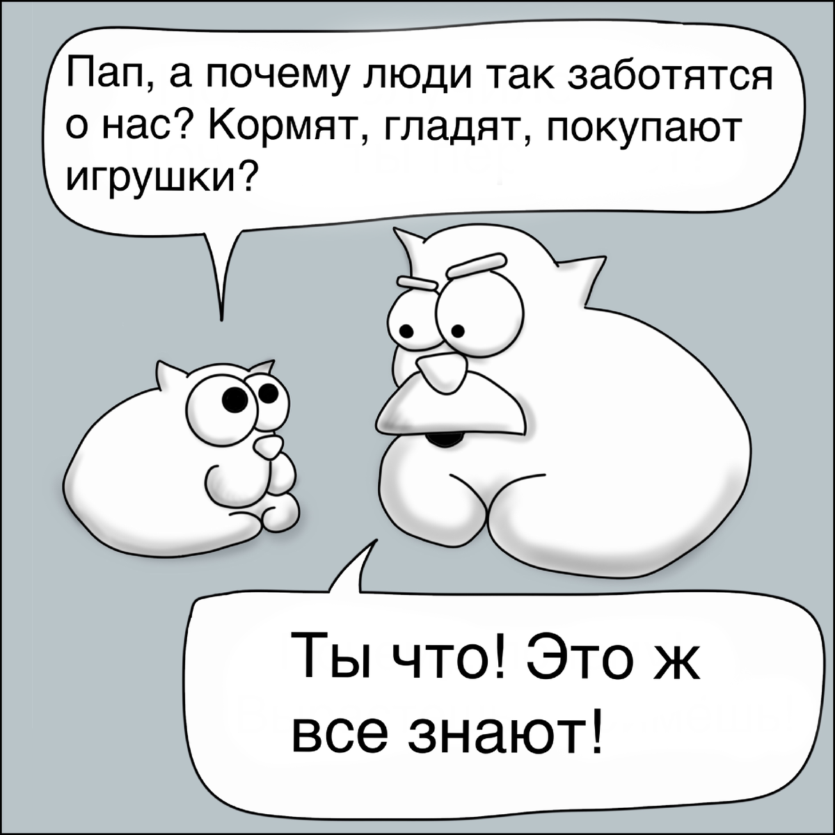 Я очень люблю кошек. Люблю наблюдать за их поведением и подмечать разные забавные причуды. Пофантазировал на тему: чем может быть обосновано такое их, порой нелепое с нашей точки зрения, поведение и изобразил в форме диалогов между маленьким любознательным котёнком и его отцом. Не забывайте листать галереи влево.