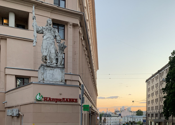 Подколокольный переулок, 16/2, стр. 1 Дом Голосова. Жилой восьмиэтажный дом (с общежитием для курсантов) Военно-инженерной академии имени Куйбышева по проекту архитектора И.А. Голосова построен на месте усадебного сада и владений по Яузскому бульвару (участки 1 и 2) в 1933-1939 годах. Здание украшают две статуи — рабочего и колхозницы, выполненные скульптором А.М. Левинским, давшие дому второе название "Дом с фигурами". Рабочий-метростроевец держит в руках отбойный молоток и книгу, а у колхозницы — винтовка. Эти предметы призваны были символизировать дух времени: аграрную, военную, индустриальную и интеллектуальную стороны интересов советского человека. Вот только построен был этот дом во времена хоть и не военные, но совсем не добрые. И, если про рабочего все более менее укладывается в идеологическую концепцию, то к образу колхозницы есть вопросы. Почему наша барышня с ружьем? Обратите внимание: сноп пшеницы она не держит. Она его закрывает рукой, защищает урожай хлеба. От кого