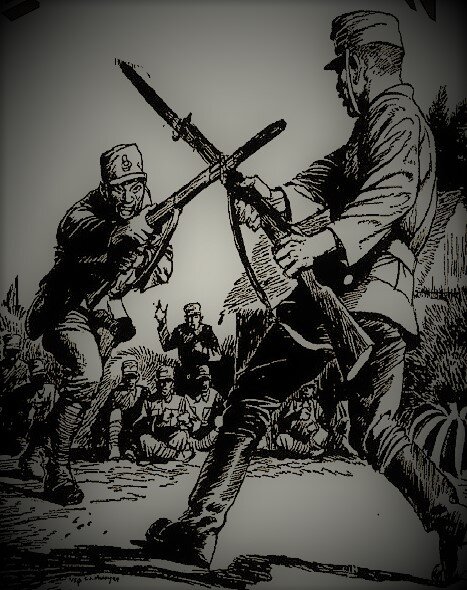 Приведенный ниже текст - сокращенное изложение моего перевода Главы 9 "Тактика японского рукопашного боя" из широко известного методического пособия Р. Эплгейта "Kill or get killed". Эта часть была написана на основе обобщения сведений, которые сообщили люди, видевшие, как японских солдат учат рукопашному бою, или же служившие в японской армии. Впрочем, можно предположить, что американцы располагали и соответствующими японскими методическими пособиями.