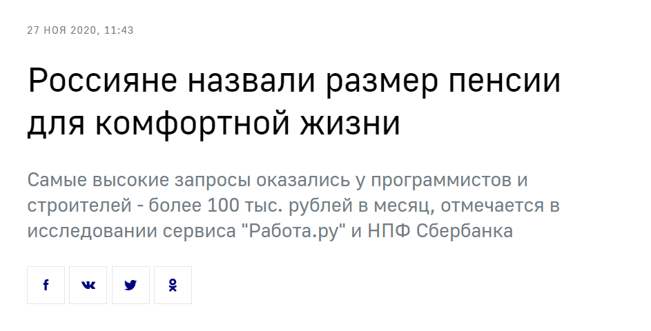 Сбербанк и сервис "Работа.ру" провели опрос по поводу размера пенсии для комфортного уровня жизни. В исследовании участвовали более 3 тыс. специалистов, работающих в восьми отраслях — финансах и инвестициях, IT, банках, медицине, строительстве, образовании, производстве и промышленности, транспорте и логистике, а также в кафе и ресторанах.