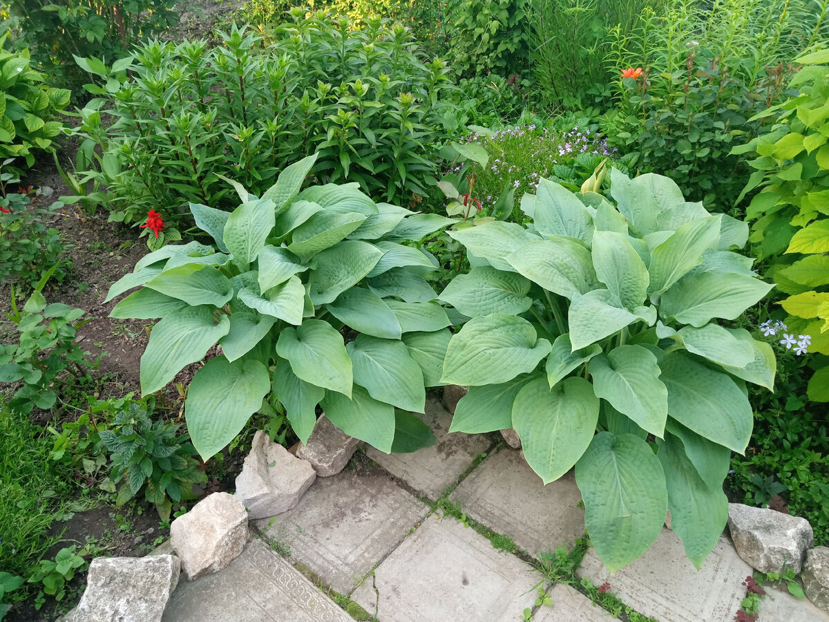 В этом году лето выдалось дождливое и мои хосты разрослись, листья выросли крепкие, темно зелёного цвета, высокие, уже выбросили цветоносы и заняли половина цветниках, при этом заслонили рядом цветущие цветы . И я решила их пересадить. Сначала лопатой выкопала осторожно весь огромный куст с землёй и перенесла на новое место, где приготовила ямки. В ямки добавила сухого перегноя, пролила водой и разделила лопатой огромный куст на пять долей. Поместила в ямки, засыпала землёй и опять пролила хорошо водой. И все последующие дни буду поливать обильно, что бы поддержать хосты, что бы они прижились. Хосты любят нейтральные почвы, любят подкормки. Я их за лето подкармливаю три раза: первый раз, как сойдёт снег и они начнут пробиваться из земли- мочевиной-, второй раз подкармливаю разведённым жидким удобрением- птичьим помётом- 1/10 л.воды и последний подкорм- это фосфорно- калийным удобрением. Последняя подкормка идёт для закладки на следующий год цветоносов. И так у нас получилось из одно