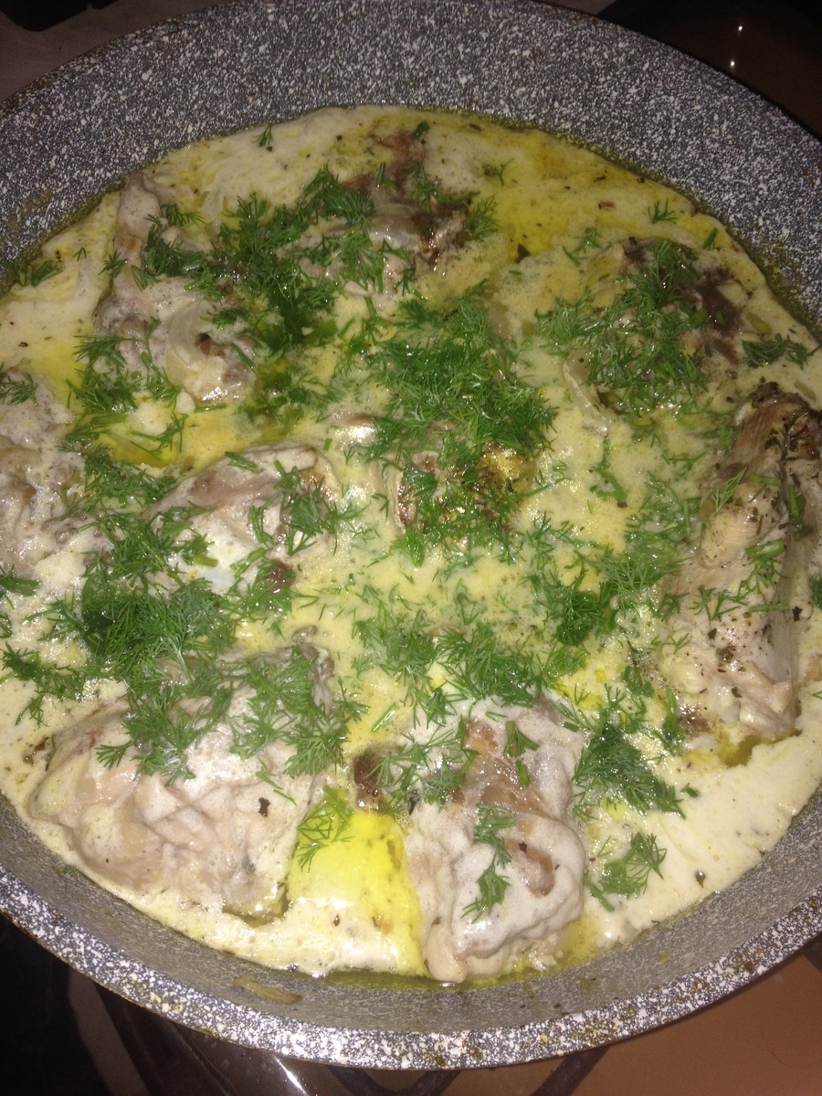 Хочу поделиться с вами, очень вкусным и простым рецептом нежнейшей курочки. Ингредиенты: Курица - 1 кг. Сметана - 4 ст. л. Лук репчатый -1-2 шт. (зависит от размера) Чеснок - 1-2 зубчика Вода (кипяток) - 200 мл. Раст. масло - 2 ст. л. Мука пшеничная 0,5 ст. л. Паприка молотая - 1 ч. л. Базилик сушеный - 1 ч. л. Соль по вкусу Черный перец по вкусу Зелень (укроп, петрушка) по вкусу 1. Подготовьте все ингредиенты. 2. Помойте и разберите на порционные кусочки курицу. (у меня это окорочка). 3. Сковороду расколите с растительным маслом. Обжарьте курочку с двух сторон до золотистого цвета. 4. Добавить нарезанный лук, обжарить вместе с курочкой 2 минуты. Затем добавить измельченный чеснок. 5. Пока курочка жариться, приготовим сметанный соус. В кипятке нужно развести сметану и муку, комочков быть не должно. 6. залейте куриное мясо соусом и доведите до кипения. После добавьте все специи. 7. Перемешайте и тушите под крышкой 20 минут на медленном огне. 8. В конце можно посыпать зеленью. 9. Ну в