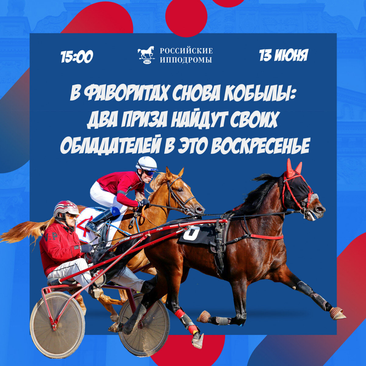 Продолжается летний сезон испытаний лошадей на Центральном Московском ипподроме: исключением не станет и это воскресенье, 13 июня 2021 года. В программе дня – 2 скачки и 11 заездов, среди которых будет разыграно 2 традиционных приза. Дистанцию 2400 метров предстоит преодолеть рысистым лошадям старшего возраста – участникам приза в честь Дня России. Главным фаворитом признается великолепная Премьера Лок под управлением Раиля Габдрашитова. Две недели назад кобыла блестяще выиграла мемориал маршала С.М. Буденного и имеет все шансы повторить успех. Соперниками Премьеры Лок выступят: Сид под управлением Наталии Плессер, Мун Мэн РМ в руках Анатолия Якубова, Лиллихаммер Лок и Кристина Соколова, Горностай Александра Несяева, Леон «Ч» под управлением Андрея Вилкина и Прайм Тайм СИН Александра Попова. Аналогичная длинная дистанция ждет орловских кобыл четырех лет в мемориале В.С. Грица. Здесь снова ожидается дуэль между Бандуристкой под управлением Алексея Гришина и Кассиопеей Виктора Б