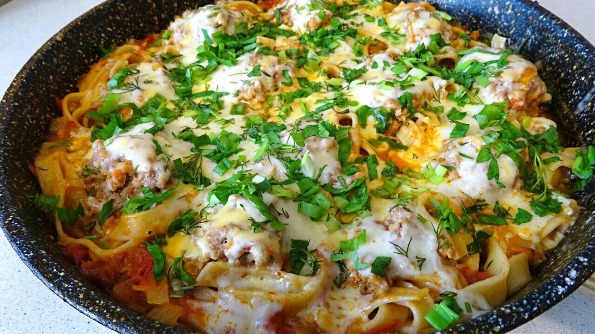 Обед всего за 40 минут. Да 40 минут - это небыстрое приготовление обеда, но блюдо очень вкусное. Моя семья его просто обожает. Оно также может подойти и для ужина. Для приготовления вам понадобится. Ингредиенты: Приготовление: 1. Морковь натираем на крупной терке. Лук мелко нарезаем. Ставим сковороду на сильный огон и наливаем немного растительного масла и добавляем в него морковку и лук. Обжариваем до золотистого цвета, затем добавляем томатную пасту и тушим 1 минуту 2. Далее на овощи выкладываем макароны и сверху в "гнездо" выгладываем фарш. Добавляем в сковороду воды столько, чтобы она покрыла макароны. Накрываем крышкой и тушим на среднем огне 30 минут. 3. По истечении времени снимаем крышку и посыпаем сыром натертым на крупной терке и снова закрываем и томим еще 1 минуту, чтобы сыр расплавился. Как только сыр расплавился посыпаем зеленью. Все наше блюдо готово. Можно Подавать. приятного аппетита!!! P.S. Все блюда приготовлены мною, опробованы моей семьею.