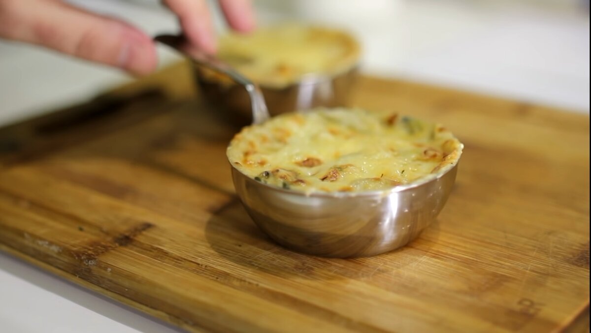 Нам понадобится: - былые грибы (можно и шампиньоны) - ветчина - сыр пармезан (можно и российский) - лук-порей - сливочное масло - молоко - зелень - мускатный орех Готовится классический жюльен в специальной таре, так называемой кокотнице. Но если у вас дома её нет, то вполне можно заменить её глиняным горшочком. Начнём готовить) 1. Нарезаем лук небольшими полуколечками. Если вы используете обычный лук, то вполне сойдёт обычная его мелкая шинковка. 2. Лук обжариваем на сливочном масле слегка помешивая. Обжариваем до того состояния, когда лук станет прозрачным. 3. Нарезаем грибы на небольшие кусочки. 4. Грибы обжариваем на подсолнечном масле. Грибы как губка и если огонь будет слабым, то они будут вариться а не жариться, поэтому обжариваем на максимальном огне очень быстро, что ьы ничего не подгорело. 5. Ветчину нарезаем кусочками такого же размера, как и наши грибы. По количеству 1 к 1 с грибами. 6. Скреплять все наши ингредиенты будет соус с красивым названием бешамель. Приступим к