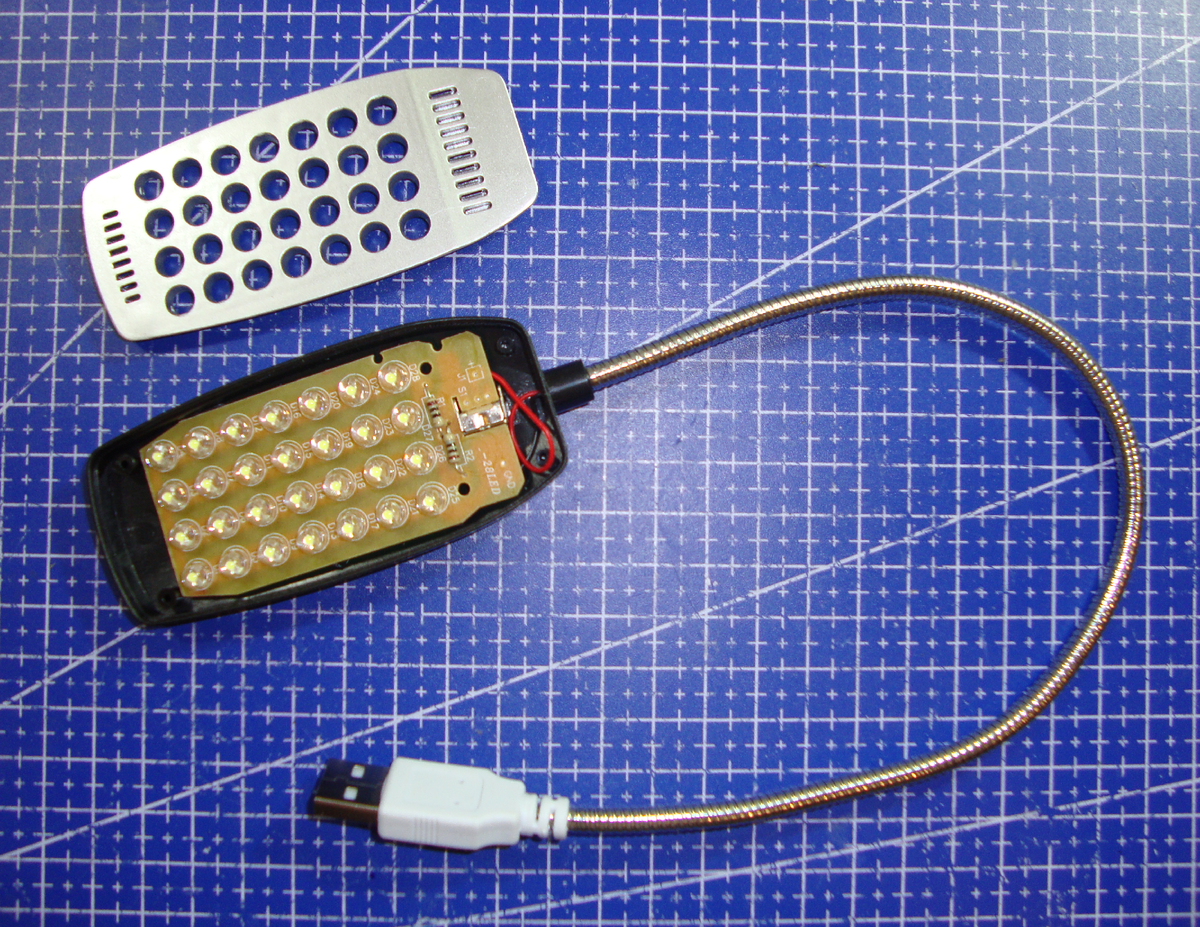 Вопрос местного освещения рабочего места был почти решен в этой и в этой предыдущих статьях, однако поднятая там проблема с нехваткой рук решена только на маленькую толику. Попробуем частично решить этот вопрос. Попав однажды на распродажу всякой мелочевки, приобрел занятные USB-светильники. Собственно, заинтересовали не сами светильники как конечное изделие, а используемая в них "гусиная шея". Цена получилась у них +/- одинаковая - порядка 110-130руб., длина одинаковая практически до миллиметра, жесткость в самый раз. Для разведения маленьких "гусят" выбрал из этих двух лампачкафф ту, которая с большим плафоном (кстати, светит отлично) только из-за того, что ее шея без изломов сгибается с меньшим радиусом, хотя это и неособо критично. Разбираем. Плафон разбирается легко - поддев, например, ножом блестящее фейслицо через щель между ним и корпусом, аккуратно сдергивается с четырех направляющих. Никаких других защелок и ничего клееного, держится только на энтузазизме этих втулок и