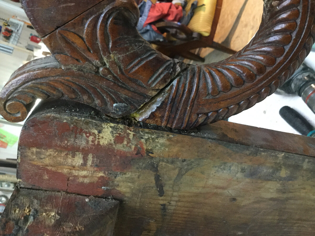 Как-то в нашу мастерскую приехали почти «12 стульев». Точнее — 6 стульев и 3 кресла ориентировочно XIX века. Владелец собрал их в «коллекцию», которая благодаря реставрации превратилась в «гарнитур». Предметы старинные, но музейными экспонатами их не назовешь. Хотя ценная часть у них все же есть — это спинка, а точнее, текстура шпона, которым она оклеена, так называемое «пламя» (поскольку под лаком переливы этого шпона похожи на пламя). Раньше это было одним из основных декоративных элементов мебели. До реставрации все предметы были в ужасном состоянии — веревками связаны, гвоздями сбиты. Когда-то они уже побывали в руках горе-«реставраторов». В итоге вместо шпона красного дерева использовали ореховый, а дефекты замазали сургучом и воском. Ну и на десерт нам досталась целая банка гвоздей, использованных вместо клея. Работы было много, порой руки опускались, но мы не сдавались. Для заделок было подобрано более 10 видов шпона и палубы, восстановлены утерянные элементы, в том числе в ре