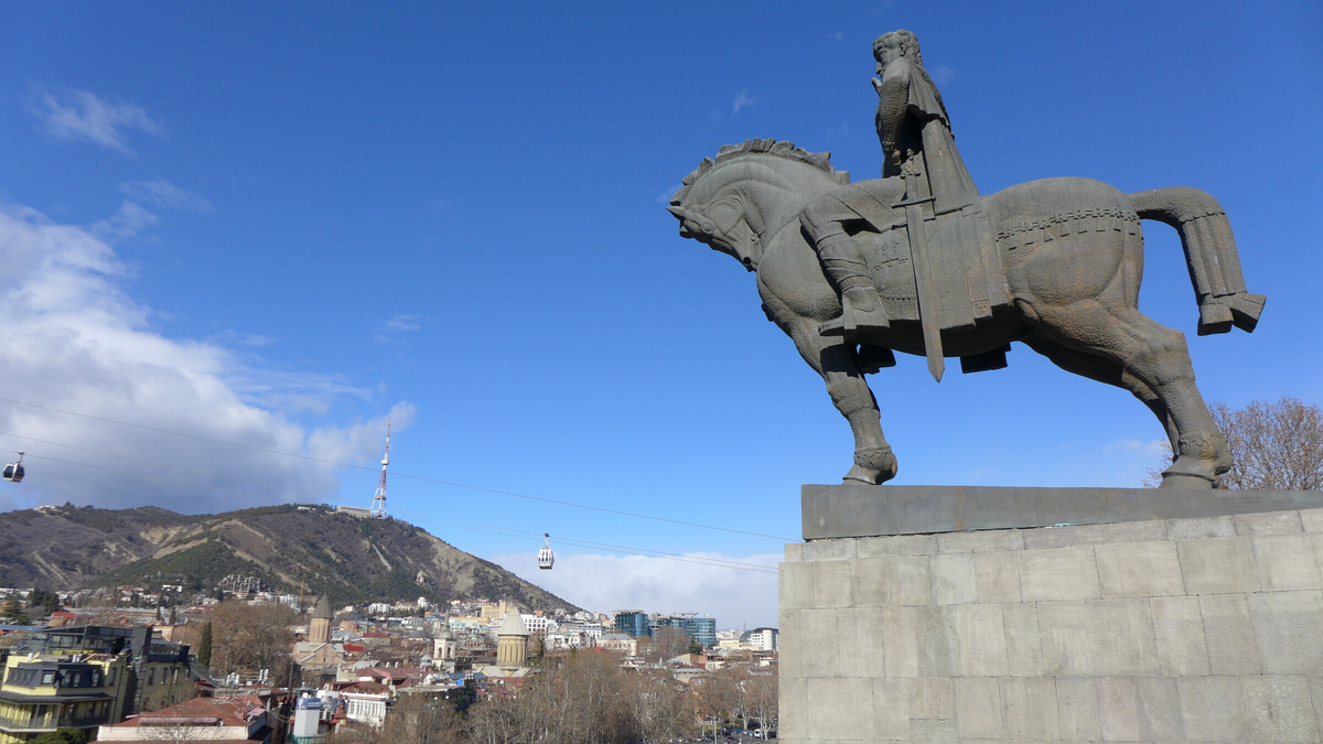 Что еще сделать в Тбилиси? По современному мосту Мира можно перебраться на другой берег реки Куры и подняться пешком в исторический район Метехи. Тут на холме стоит Успенская церковь, построенная в XIII веке, а перед ней — скульптура Вахтанга Горгасала на лошади.