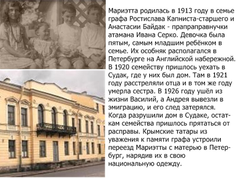 Марию Капнист лучше всего зрители помнят, пожалуй, по образу «графини» в телефильме «Бронзовая птица». Но советским поклонникам кино вряд ли могло прийти в голову, что роль в картине исполняет самая настоящая графиня! Происхождение Сломанная карьера Но дворянские корни при советской власти не были в почёте, а потому в 1934 Капнист исключили из института и запретили проживать в столицах. В 21 год девушка выучилась в Киеве на бухгалтера и устроилась на работу – сначала в Киеве, потом перебралась в Батуми. Арест Но потомственную дворянку органы безопасности разыскали и в Грузии. В начале войны её арестовали «за шпионаж» и приговорили к исправительно-трудовым лагерям. Рождение дочери Здесь, на работах Степлага, она в 1949 году в тюремной больнице родила дочь Радиславу. Освободившись из заключения в 1949 году, осталась на поселении в Красноярском крае. Незримая поддержка Она помнила, как во время ночных допросов ослепляли и обжигали лампой, а то и бросали в холодную воду. Как страшно было