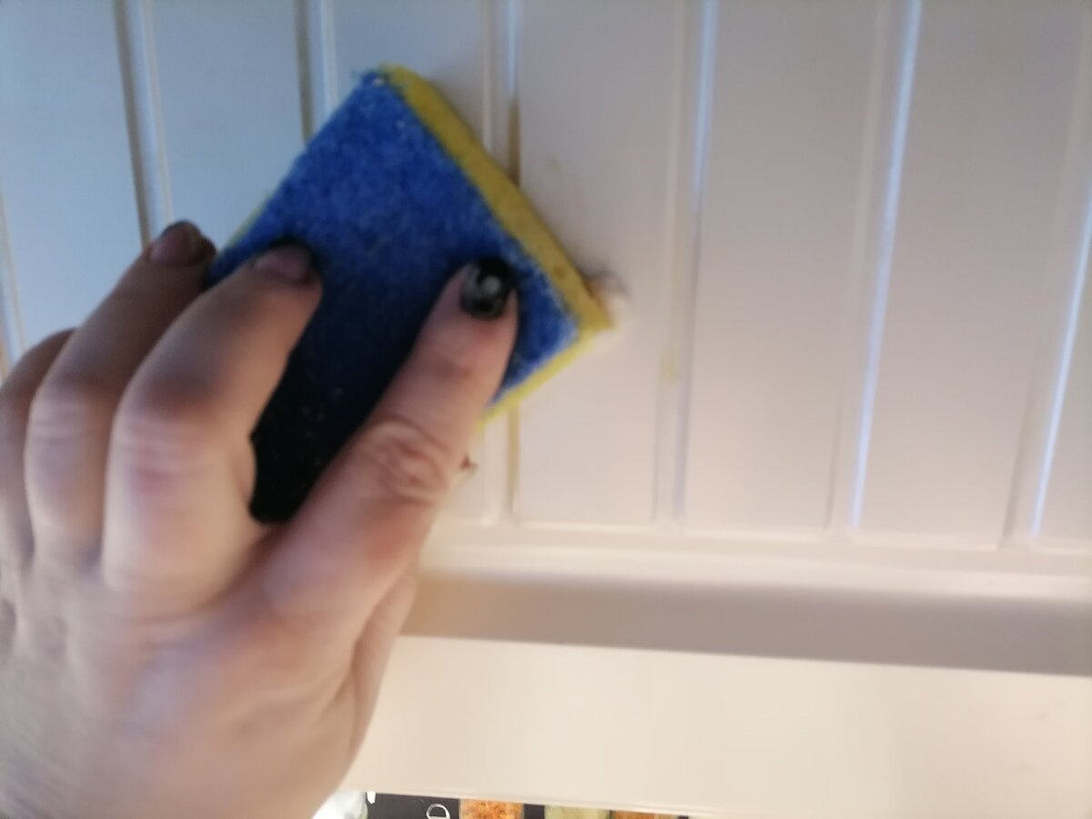 2. Затем при помощи губки для мытья посуды нанести кашицу из соды и перекиси на фасад кухни.