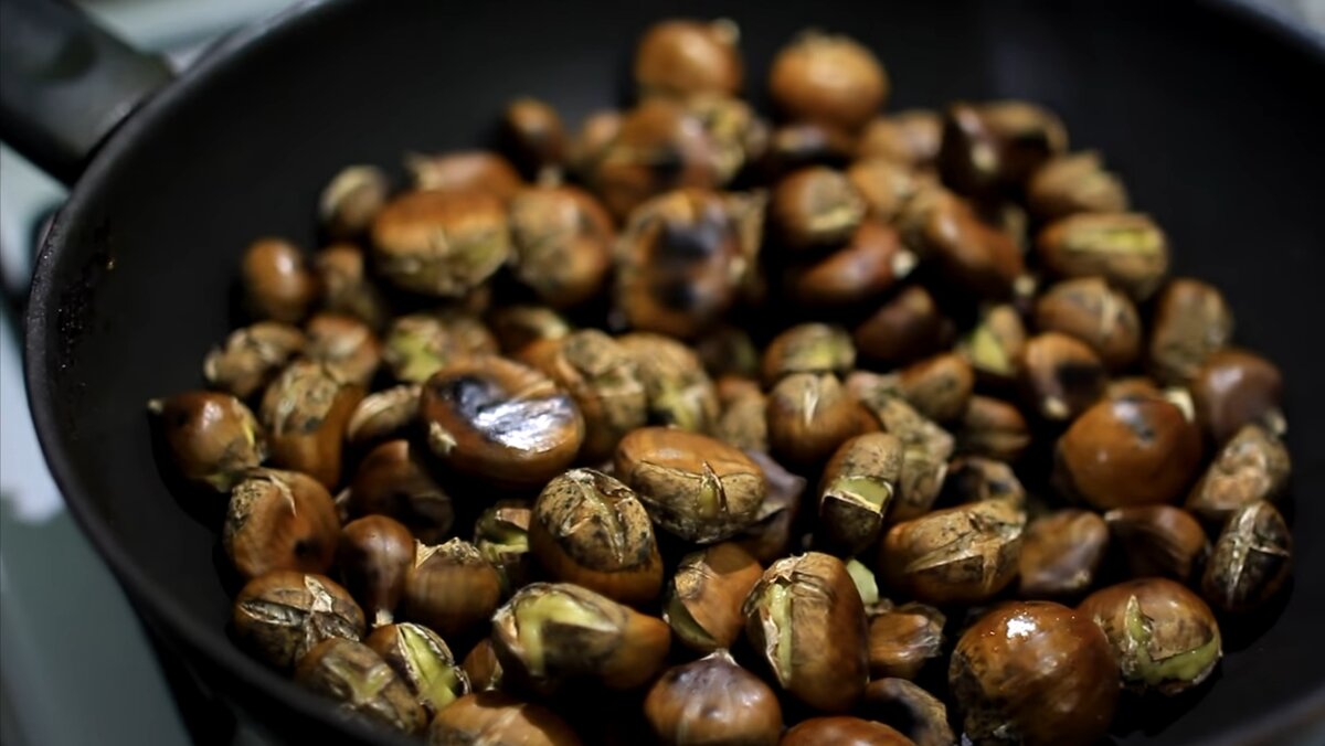 ВАЖНАЯ ИНФОРМАЦИЯ Каштаны должны быть не обычные, а французские. Их можно найти в ботанических садах, заказать в интернете или в каких-то необычных магазинах. Нам понадобится: - французские каштаны - сковорода 1. Надрезаем каштаны крестиком на светлой верхушке для того что бы они раскрылись в процессе жарки и пропеклись внутри. 2. Высыпаем каштаны на сковородку и жарим на среднем огне минут 15-20. На вкус напоминает сладкую картошку с лёгким привкусом креветок. В сочетании с мёдом получается очень не плохой десерт. Приятного аппетита!!! Рецепт и фото взяты из youtube с канала "oblomoff"))