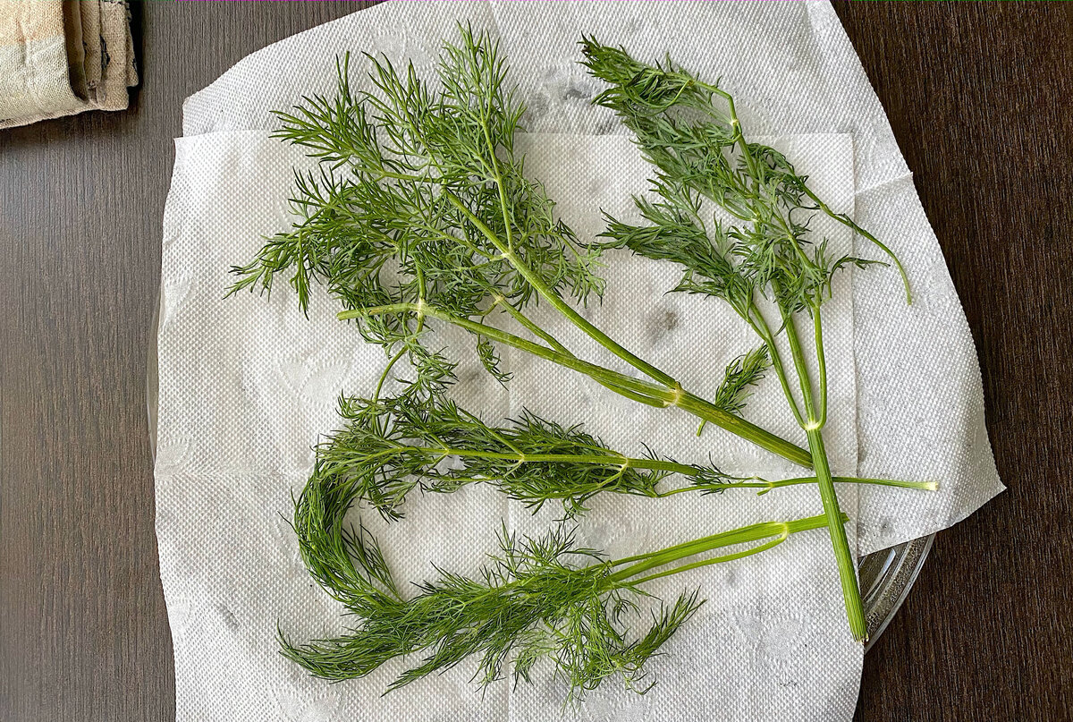 - Далее застелила блюдо для микроволновки салфетками и выложила веточки укропа.