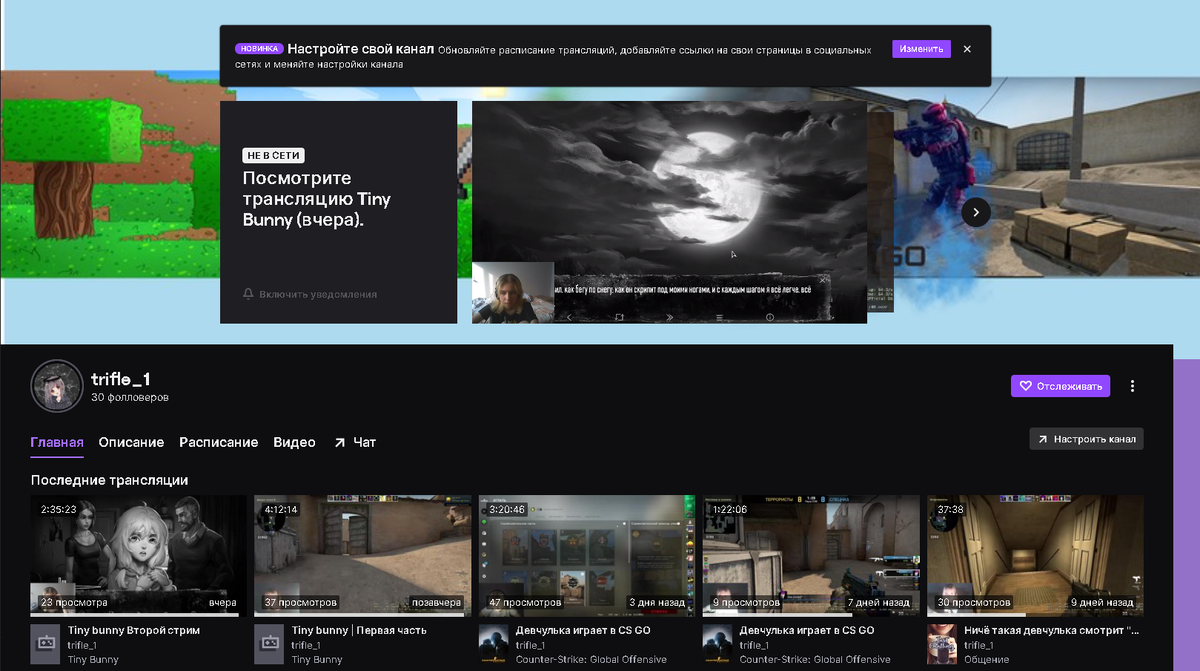 Всем доброго времени суток. Мне бы очень хотелось поделиться с вами моим профилем на Twitch . Я начинающий блогер и мне бы хотелось набрать свою , хотя бы небольшую аудиторию. Если вам станет интересно, то прошу вас поддержать меня вашей подпиской. И если вы не против, я расскажу вам о себе. Информация: trifle_1 Девушка на районе. Ведёт свой Twitch канал. Ищет тебя для нашей аудитории. Основные две игры, которые меня привлекают - это Minecraft и Counter-Strike: Global Offensive. Конечно, эти две игры не основные, я играю также в другие, так что на моём канале есть разнообразие. Мои стримы проходят буквально каждый день. Так, что вы не соскучитесь. Предлагаю вам немного ознакомится с моим каналом, посмотрев несколько клипов: https://www.twitch.tv/videos/1051939089 https://www.twitch.tv/videos/1051924226 https://www.twitch.tv/trifle_1/clip/SleepyAliveSalamanderOhMyDog-wjP-V2RIQgcODrWy Очень надеюсь, что вам понравится мой канал. https://www.twitch.tv/trifle_1 Спасибо, тебе, огромное.