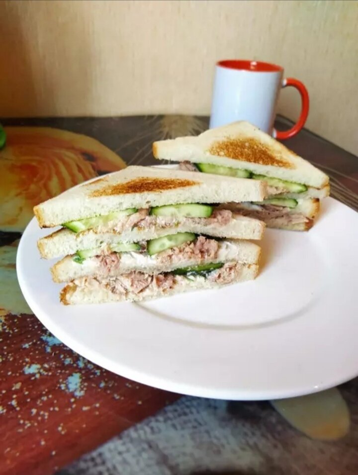 - Собираем сэндвич, на хлеб намазываем соус, затем тунец, огурец, и так далее.
