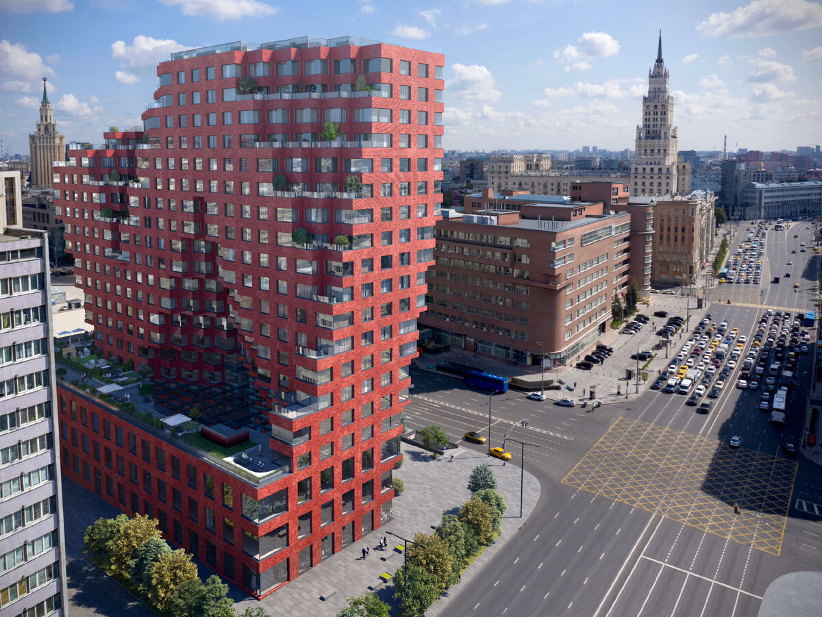 Здание с уникальными непрерывными лифтами. И по цвету почти подходит, как и красные кирпичные дома за ЖК по Скорняжному переулку.