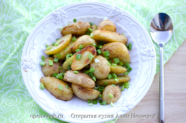 Ну вот и пришло время свежего картофеля. С ним можно сделать все что угодно, например, запечь. Все просто, легко и быстро. А, главное, вкусно :) На 2 порции: В глубокую миску сложить чеснок, натертый на мелкой терке или измельченный ножом, и соль. Растереть чеснок с солью ложкой. Добавить масло и перемешать. Картофель помыть хорошенько и обсушить бумажным полотенцем. Крупные клубни разрезать на 2-3-4 части, чтобы получились небольшие дольки. Сложить их в миску и перемешать, чтобы все дольки покрылись маслом с чесноком. Выложить в форму или разложить на противне. Отправить в духовку, разогретую, до 200 градусов, минут на 20-30. Молодой картофель быстро готовится. Но не забудьте все же проверить его на готовность. При подаче посыпать картофель свежей зеленью. Приятного аппетита! Рецепт впервые опубликован на сайте open-cook.ru: 04.06.2014, набрал просмотров: 3747 и комментариев: 0