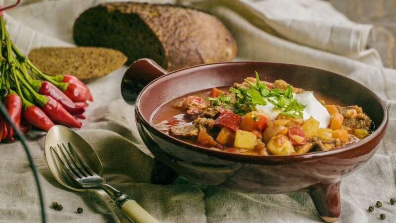 Размешайте и тушите еще минут 5. 5. Для чипетке смешайте муку с солью и яйцом. Должно получиться крутое тесто. 6. Замесить тесто, а затем. отщипывая по кусочку, скатайте маленькие шарики. 7. Чипетке положите в гуляш, тушите еще пару минут, добавьте оставшуюся половинку чили, приправьте зеленью. 8. Гуляш с чипетке подавайте горячим.