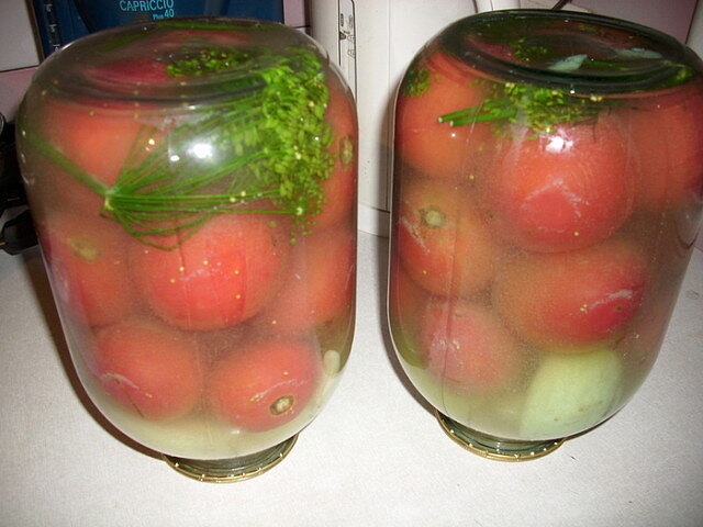 Не кислые, не острые, но просто замечательные! От засоленных деревенским методом в бочонке не отличишь... На трехлитровую банку надо взять - 1 среднюю луковицу, разрезанную пополам - половинку яблока, лучше кислого - 2 столовые ложки соли - 1.5 ложки сахара - 1 столовую ложку порошка горчицы ну и немножко чесночка, укропа и хрена, чтоб душисто было. Помидорчики моем и в банку выкладываем, сверху располагаем разрезанную луковку и половинку яблочка без семечек. Заливаем кипятком до горлышка. Минут 5-10 постоит, эту водичку сливаем добавляем в нее соль и сахар и снова кипятим. Это действо так и называется - метод двойной заливки. Рассол заливаем в банки, а сверху кладем ложку горчичного порошка и быстренько закатываем. Видите какой рассол мутный получается? Ну только это не страшно, банки постоят и горчица на дно осядет, так что все в конце концов будет прозрачно, чинно и благородно.