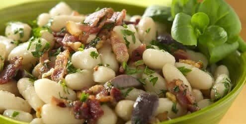 - Шпик мелко нарезать кубиками, обжарить в масле, смешать с бобами, толченым чесноком, тмином, семенами тыквы и прогреть.
