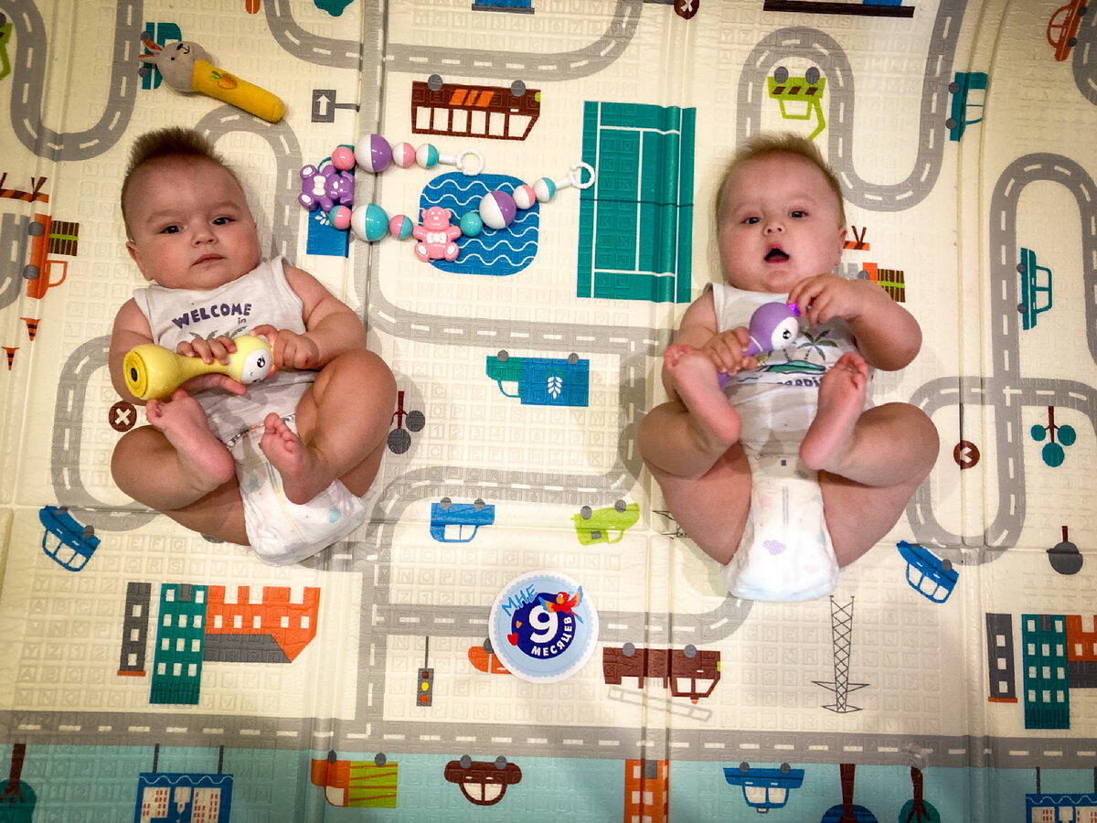 Приветствую дорогие читатели! Как банально везде пишут: «9 месяцев внутри и 9 месяцев снаружи». У нас так и получилось. 37 недель были у меня под сердцем и 37 недель радуют нас с мужем своими умелками, достижениями и улыбками. 9 месяцев пролетели как пару дней. Только недавно были малюсенькими, легкими и спали целыми днями. То теперь за ними глаз да глаз нужен. Быстро растут, но я успеваю насладится каждой новой умелкой. Оба: Женя: Саня: Вес и рост мальчиков: Саша —12,750 г ( +600 г за месяц и +10,280 г с рождения), 81 см (+1 см за месяц и +36 см с рождения) Женя — 10,550 г (+1,250 г за месяц и +8,080 г с рождения), 74 см (+1 см за месяц и +29 см с рождения) Вот так детки снова набирают в весе, но это им не мешает быть активными. Саня вообще меня удивляет весь месяц. Пополз, начал сначала подтягивается за опору, теперь и на коленки встает, на четвереньки встал и раскачивается. Если Женя еще каждый навык отрабатывает недели 2-3, то Саньке нужно пару дней и начинает новое показыват