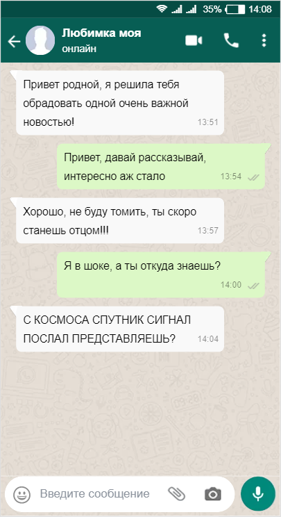 Добрый день дорогой читатель, я составил для тебя подборку самых забавных и весёлых переписок любовных парочек, скажите, а у вас какие случаются смешные случаи в отношениях с вашей второй половинкой? Начну с переписки, где девушка решила обрадовать своего любимого очень интересной новостью, новость которая рано или поздно приходит ко всем мужчинам. Что же там было, читайте: Ахахах, вопрос действительно странный, если конечно у него помимо этой любимой, нет ещё двух сот таких же))) Ей наверное даже мысль такая не пришла, раз она шутить начала. Перейдём к следующей переписке, тут девушка просит любимого рассказать, какая песня у него ассоциируется с ней, ответ убил: Вот так вот))))) Бывает и такое, не знаю, что у него там за девушка, но судя по ответу не из лёгких. И последняя переписка на сегодня самая горячая, без лишних слов читайте: Я же сказал, переписка самая горячая) Горячее только трубы с трусами). Девушка конечно конкретно влипла, хотя по сути получается, она ради семейного бл
