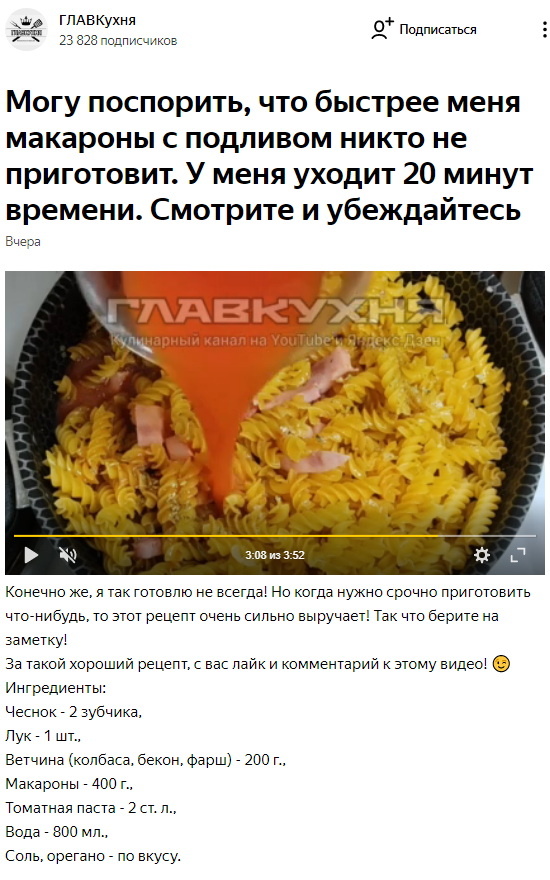 Не забывает развлекать своих подписчиков канал главкухня. На днях у него появмлось новое блюдо под названием "Макарны с подливом" Можно сказать, что уже сам заголовок "шедевр". Смотрите сами, автор в заголовке уверяет что на весь рецепт уйдет всего 20 минут. Решив, что ему не поверят, он далее написал следующее: "Смотрите и убеждайтесь". Мне интересно, как при просмотре данного видео которое идет менее 4 минут, можно убедится в том что автор не солгал? Вообще если говорить по поводу заголовка то я было подумал, что автор описался, но как выяснилось это я не грамотный, очень плохо знаю русский язык и поэтому нечего не понимаю. Я не понимаю вот что, зачем придумывать велосипед, когда его до вас уж придумали! Сейчас есть много разнообразной еды быстрого приготовления, но подобные деятели в погони за рейтингом не гнушаться выдавать подобные рецепты за кулинарное творчество. Правда в данном случае автор для подстраховочки, ниже видиорецепта подписал, что этот "шедевр" он готовит не всегда,