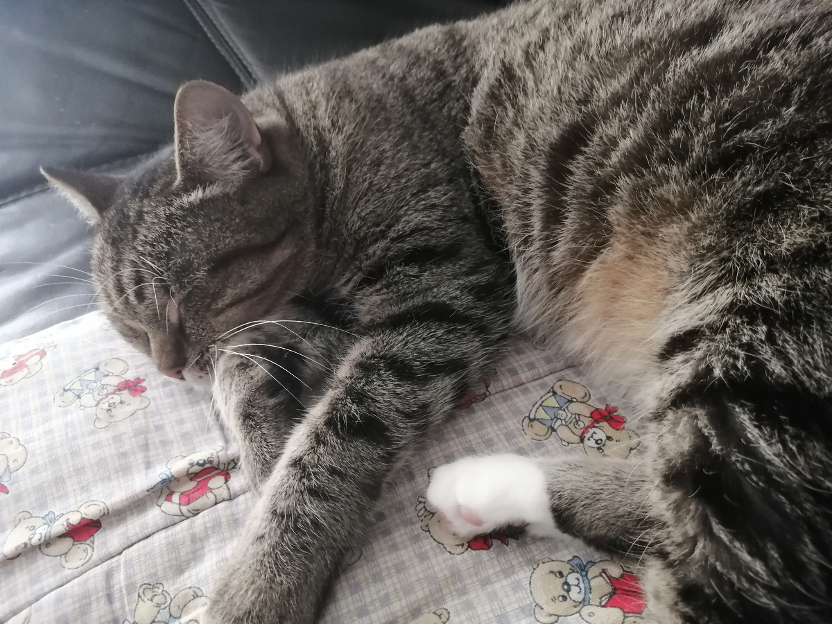 Когда мы её забирали, думали: Подлечим, стерелизуем и выпустим обратно на улицу, т. к. у нас дома свои два кота. Но после стольких мучений, перенесённых этой мурлыкой, мы очень привязались к ней, к тому же она оказалась очень ласковой и благодарной. Да ещё предстояло удалить спицы и таким образом (мы её забрали с улицы осенью в сентябре, она прожила у нас всю зиму, весну и уже наступило лето) и уже все понимали, что не сможем выпустить её обратно на улицу, тем более что она до сих пор прихрамывает,а иногда и вовсе не наступает на больную лапку. Сейчас Она оправилась, стала весёлой и жизнерадостной кошечкой, очень подружилась с нашим котиком Баксом, и в догонялки играют, и спят в обнимку. Вот так мы и решили её оставить у себя, где двое там и трое. Дети назвали её Лаской, за добрый и ласковый нрав.