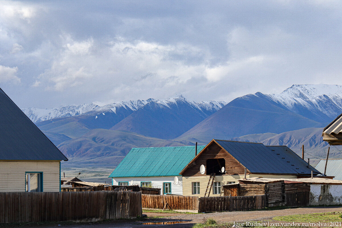 Если бы не заснеженные горы на заднем плане, можно было бы спутать это село с любым другим в России. Такие же маленькие домики, деревянные заборы, грунтовые дороги и, к сожалению, отсутствие нормальной инфраструктуры. Но есть у этого села по крайней мере одна особенность — это его географическое положение. Расположено она высоко в горах Алтая практически на границе с Монголией, а значит отличается здесь и климат, и люди, и даже местные кафешки и прочий бизнес несут отпечаток своеобразного монгольского колорита. Село называется Кош-Агач, живет здесь чуть больше десяти тысяч человек. Село окружают высокие горы — настолько высокие, что в середине июня на вершинах еще лежит снег. Да и сам Кош-Агач находится на высоте почти 1800 метров, поэтому климат здесь совсем не похож на равнинный. Максимально зарегистрированная температура летом здесь составила +38 градусов, минимальная зимой — -62 градуса. Итого перепад температур за год может составлять до 100 градусов по Цельсию: адская жара летом