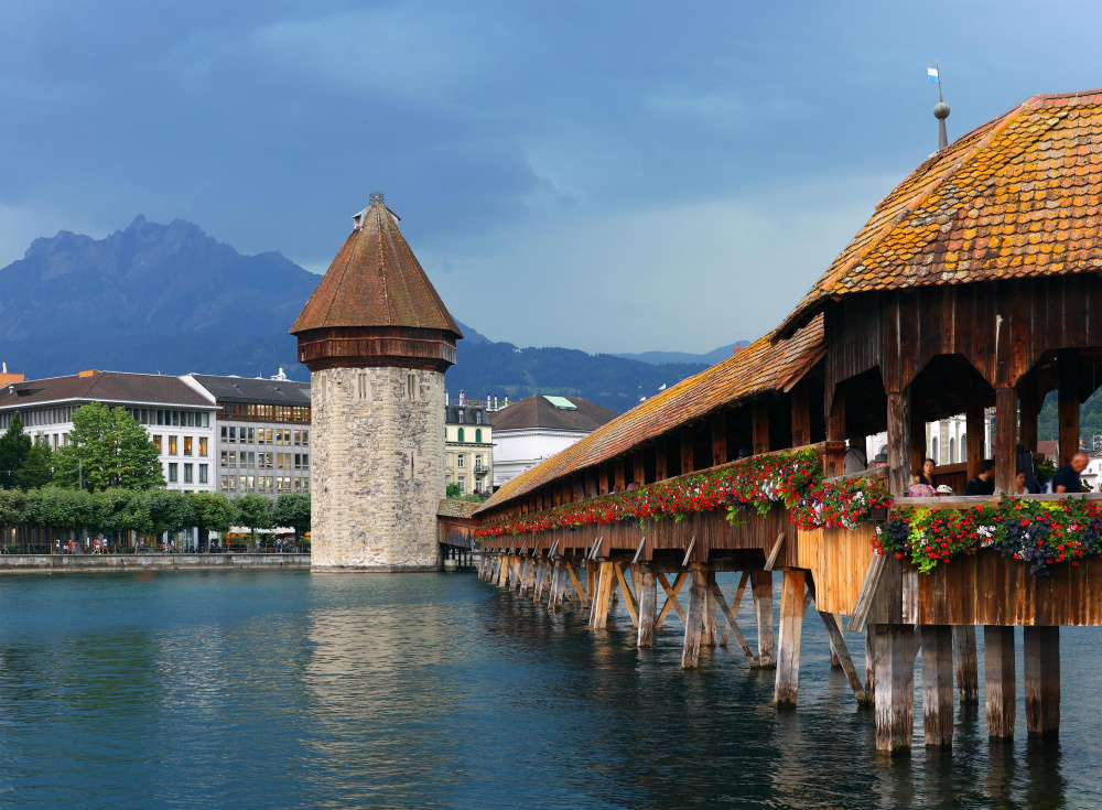 - Одна из самых популярных достопримечательностей – часовенный мост Kapellbrücke, средневековый деревянный пешеходный мост, построенный в 1333 году, что пересекает реку Ройс, соединяя Старый город с правым берегом. Пожар 1993 года практически уничтожил знаменитый деревянный мост, повреждения от пожара видны на оставшихся панно XVII века, которые находятся под карнизом.