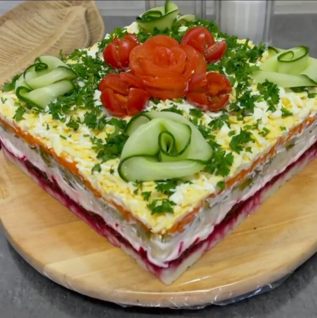 Дежурный овощной торт из нашего детства 😍 Это оооочень вкусно!!! Для приготовления нам понадобится: 👉Картошка -3-4 шт 👉Морковь -3-4 шт 👉Свекла -2 шт 👉Яйцо -5 шт 👉Солёные огурцы -4-5 шт. 👉Майонез/сметана/нат.йогурт на ваш вкус и усмотрение 🤗. Приготовление: Морковь, свеклу, картошку, яйцо всё отварить. Все ингредиенты натереть на терке. Первый слой уложила картофель, потом свеклу, опять картофель затем огурцы (так не вытекают соки от огурцов и свеклы, картошка впитывает). Затем уже морковь и яйцо. Каждый слой майонез. Украшаем по желанию. И да, все ингредиенты солим до того как собрать салат. А в свеклу и морковь я люблю ещё добавлять немного чесночка 🥰. Будете готовить дома? Делитесь впечатлениями! Приятного аппетита!!🍴☕