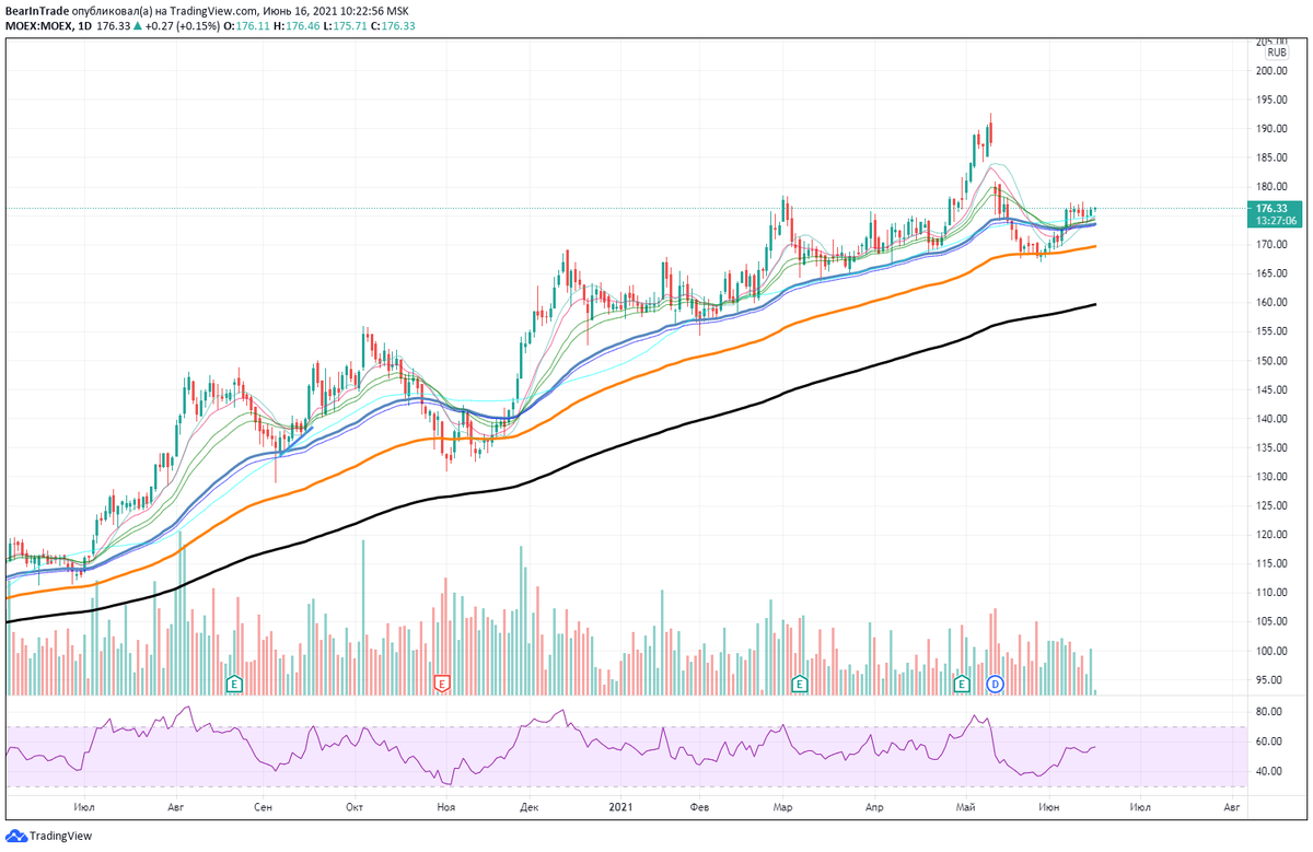 Акции главной биржи в России весь 2021 год радуют своих инвесторов очень сильным ростом, даже во время сильных потрясений на рынке. Это очень легко объясняется сильными показателями компании. Стоит взглянуть на график активных клиентов на Московской Бирже: Однако сегодня мы разбираем не график количества активных клиентов биржи, а график цены акций данной компании. MOEX - Дневной график Дневной график акций Мосбиржи не так давно пережил очень сильное падение, вплоть до 100-дневной скользящей средней. Выход за нее означал бы разворот тренда на финансовом активе. Однако данная поддержка выдержала и акции вышли обратно за линию сопротивления в виде 50-дневной скользящей средней. Нахождение цены над данным сопротивлением является для нас сигналом ко входу в позицию. Параболическая формация, к сожалению, была прервана и акции не отскочили в виде U-образной формы, но несмотря на это, мы все еще видим потенциал роста. MOEX: Определяем вход на внутридневном графике На внутридневном графике