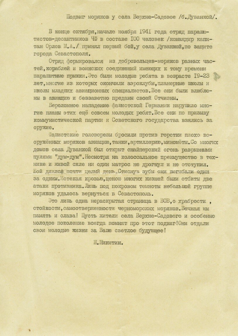 Есть удивительные факты. О роте парашютистов в обороне Севастополя. упоминали многие, а в документах ничего нет. Бои за д. Дуванкой (совр. Верхнесадовое) 4-6 ноября 1941 года вообще тема очень сложная. Противник, отразив нашу атаку, сам перешел в наступление. 437-й пп в 8.30 захватил д. Дуванкой, и в 9 часов атаковал высоту 158,1 (над ст. Бельбек). В донесении 50-й пд указано, что в 9.30 советские войска силами двух батальонов еще удерживались восточнее д. Дуванкой. Как такового, боя за деревню почти не было. Сопротивление противнику оказывали только отдельные группы. Из воспоминаний Л. Репкова: «Во время боя в деревне мы наблюдали героический подвиг трех советских моряков, фамилии их, к сожалению, остались неизвестны. На полуторатонной машине был установлен счетверенный пулемет. Его обслуживали два моряка-пулеметчика. Когда немцы входили в деревню, машина стояла на шоссе, между двумя улицами, расположенными перпендикулярно к шоссе. Как только из одной из улиц немцы вышли на шоссе,