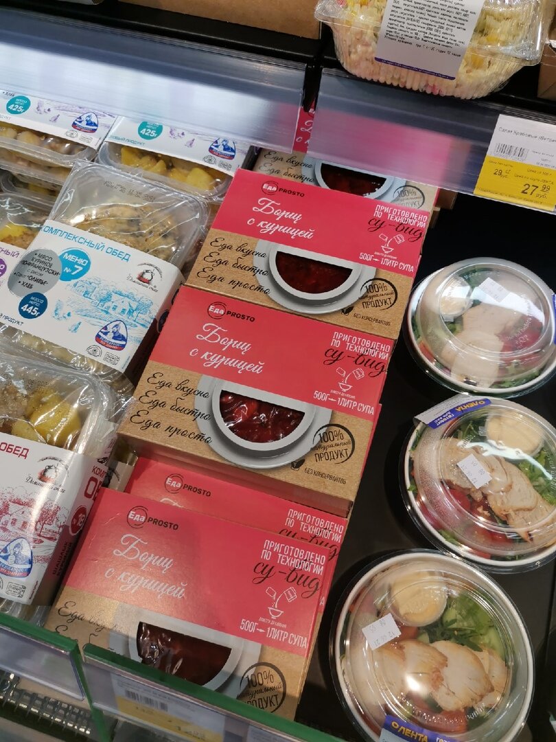 Кто постоянно отправляется за покупками в гипермаркет, знает, что там есть целая витрина, где собрана готовая кулинария. Часть продукция от самого магазина, а часть от других производителей. И мой взгляд как раз зацепился за эти симпатичные коробочки под названием "Еда Prosto", где спрятаны различные супы.
