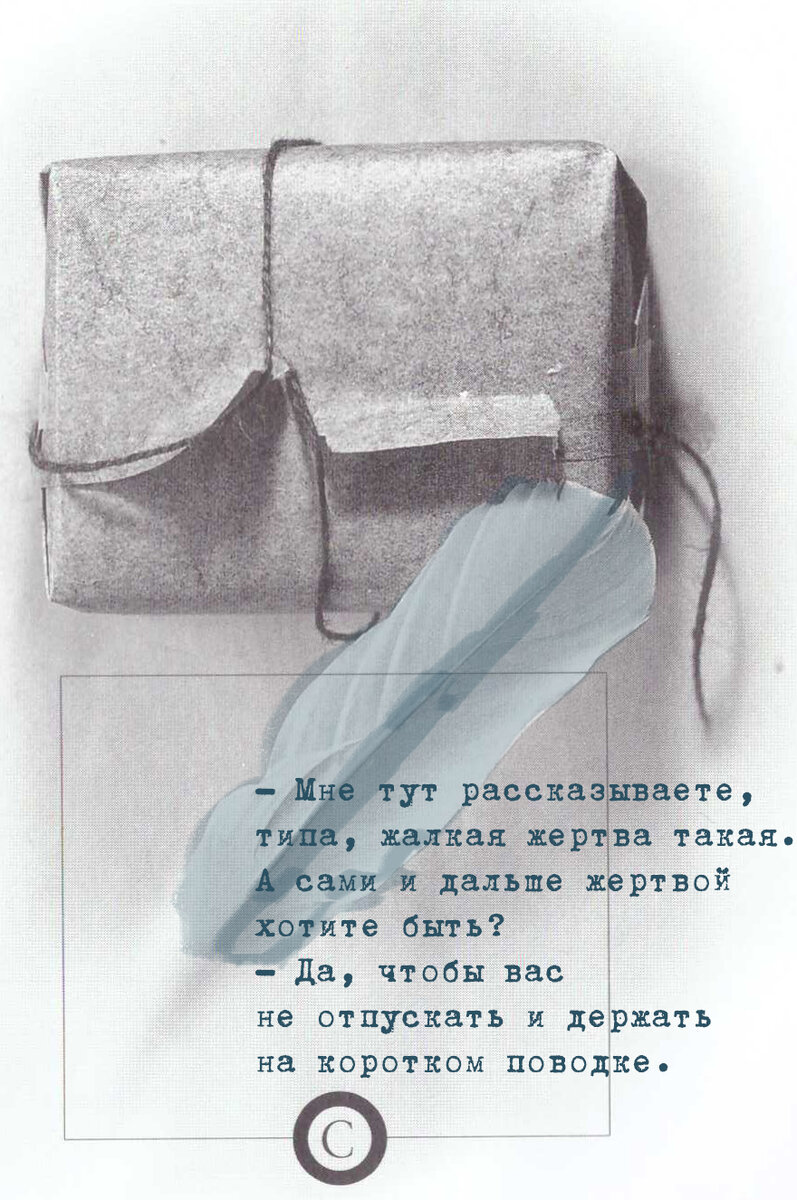 — Из меня мама классную жертву воспитала и в собственной семье я чувствую себя никчемной и ненужной. У меня мама очень авторитарная была. У меня уже тридцать шесть лет опыта жертвы получено. — Так, а что так нерадостно? Получено же тридцать шесть лет. Вот вы расскажите нам, что это за опыт жертвы такой? Никчемность, ненужность, что там еще? — Полное забвение себя, растворение в интересах других людей. Неумение высказать свои желания. Ты запрограммирован только сидеть дома, суп варить, детей лечить. Вот сидишь — и сиди себе. И даже наличие работы никоим образом не повышает мой статус. — Такое ощущение, что безысходность полная у вас. Я ведь сейчас не пожалеть вас хочу, что вы, дескать, униженная, живущая с ужасным мужчиной, находитесь в бедственном положении и что нам нужно спасать вас, чтобы он вас не погубил окончательно. Я не об этом. Я наоборот говорю, что вы нашли эту семью для получения опыта этой самой жертвенности, который вы сейчас проживаете. А потом я вас спрашиваю: «Как вы?