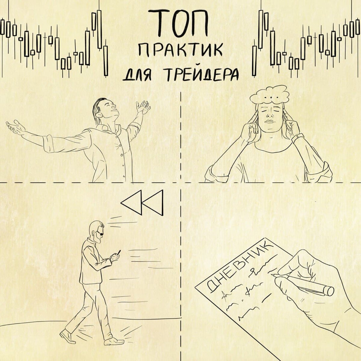 ТОП практик для трейдера и инвестора, которые помогут пройти по минному полю биржевой торговли с минимальными потерями. P.S. Скажу сразу, даже если практика покажется Вам простой или слишком легкой, попробуйте сделать их в реальной стрессовой ситуации или хотя бы вспомнить о их существовании. Как в трейдинге, так и повседневной жизни. Итак… № 1. Глубокое дыхание. Стараемся «дышать животом», очень медленный вдох носом и выдох ртом. Минимум 10 раз. Простая практика для насыщения организма кислородом, расслабления и снятия стресса. №2. Остановка внутреннего диалога. Эта особая способность останавливать мыслительный процесс и пустую трату энергии и сил на диалог с самим собой. Особенно в тех ситуациях, когда он неуправляемый. Есть несколько подходов, и Вы должны выбрать наиболее эффективный и подходящий именно Вам. Все они сводятся к тому, что нужно сфокусироваться на 2-3 динамических процессах или объектах, тем самым «перезагрузиться». Подходы строятся на 3 основных каналах восприятия реа