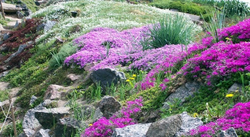 Современный ландшафтный дизайн не может обойтись без альпийской горки. Несмотря на то, что ваш приусадебный участок может быть в заброшенном состоянии, например, где-то, быть может, вы найдете куст калины и самую обычную елку даже с отломанной верхушкой, а если еще и мусор, то вообще получится картина маслом. Мусор конечно можно расчистить, но из такого набора можно еще и сделать альпийскую горку своими руками. Чтобы сделать альпийскую горку своими руками, нужно начать с: 2. Далее на местности расчертите все точно по вашему плану и перенесите рисунок. Можно расчертить все слои сразу, тогда у вас будет возможность что-то подкорректировать. Можно выложить границы камешками и колышки с бечевкой. 3. Границы нижних слоев альпийской горки выложите камнями крупными, так как альпийская горка своими руками сделанная должна быть превосходной, а именно этот эффект получается от крупных камней, кроме того, мелкие камешки быстро врастут в землю. Прежде чем укладывать камни, нужно убрать рыхлую почв