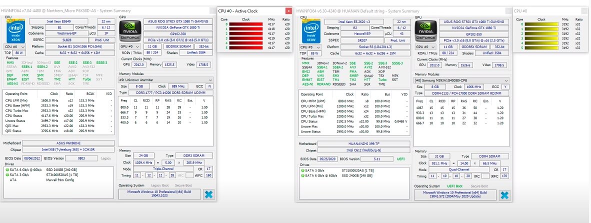 Справа система Xeon E5 2620v3. Этот процессор работает с Uанлоком турбобуста и андервольтингом на 90mV. В результате, частота его ядер поднимается до 3,2GHz при достаточно низком напряжении 0,84V. Частота контроллера памяти составляет ровно 3GHz. Xeon E5 2620v3 позволяет использовать множитель ОЗУ DDR4 только 1866MHz, но, зато, в четырёхканальном режиме. Тайминги я ужал до 11-10-10-20 с tRFC 170. Видеокарта GTX1080 Ti в максимальном разгоне, ядро 2GHz, память 12 160MHz.