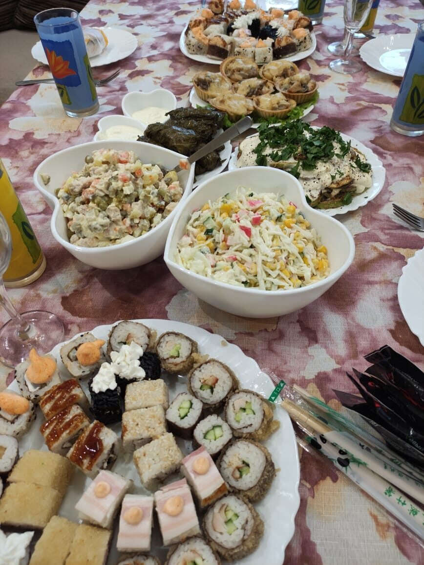 Вот живешь ты такая живешь, а потом - раз и 16 уже не тебе, а твоему сыну. Конечно, это надо отметить! И угощение просто необходимо - делюсь нашим простым столом и простыми рецептами. В нашей семье заведено отмечать свой День Рождения сначала с родственниками. Это происходит непосредственно в День Рождения, а потом уже отмечаем с друзьями. Иногда не один день))) Современные дети обожают любой фаст- фуд и мой ребенок не исключение. Попросил заказать роллы и пиццу, а приготовить салат с крабовыми палочками и "Оливье". Но так как к нам придут еще дедушки, решила еще кое-что доготовить. В планах было более крупное меню, но наши обе бабушки заболели(((( Поэтому приготовила только основные блюда. Делала все только самое простое - ведь времени у меня совсем в обрез. 1. Заказала роллы и пиццу. Еще одну пиццу сделала сама. Мой рецепт пиццы можно посмотреть здесь. 2. Жаренные в муке кабачки с сметанно-чесночным соусом и долма. Рецепт долмы здесь. 3. Жульен в тарталетках. Очень вкусна