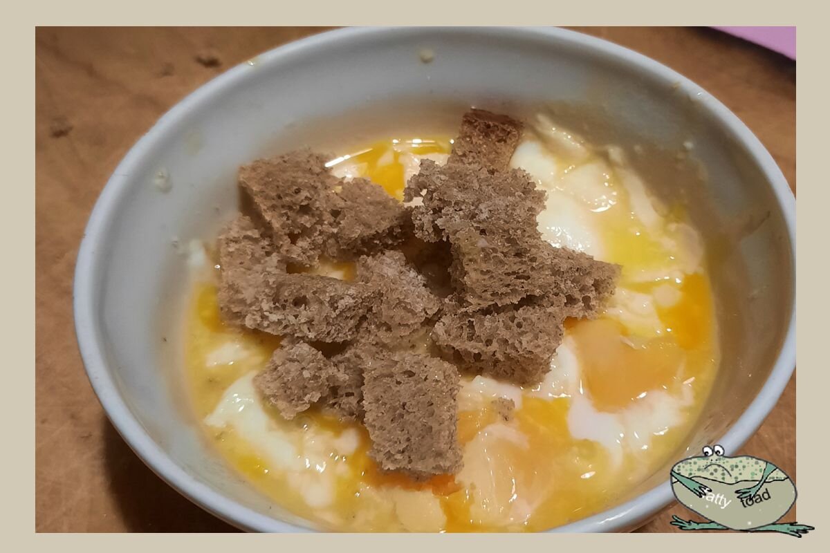 Кстати, я тут подумала. Если яйца сварить почти " в мешочек", а из хлеба сделать мягкие чесночные гренки, блюдо должно заиграть новыми красками!