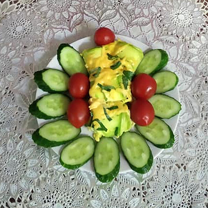 Кабачки нарезала полосками толщиной 4-5 мм. Полоски присолила для эластичности. На полоски выложила по ложечке фарша. Скрутила рулетики, сложила в жаровню, залила заливкой (яйцо, сметана, соль). Фарш: куриное мясо и обрезки кабачков, соль, перец по вкусу. И в духовку на 25 минут при 180 градусах. Потом посыпала сверху тёртым сыром и зелёным луком, и ещё на 5 минут. Делала первый раз. Для меня немного пресновато. Но с помидоркой и брынзочкой с укропом (делала сама) очень даже ничего. И мужу понравилось. Будьте здоровы, и всем - положительных эмоций! + 3 фото Больше общения и рецептов - в группе "Жизнь с диабетом" в Facebook и одноимённом Telegram-канале! Рецепт на странице в Facebook Автор рецепта - Лидия Кушниренко