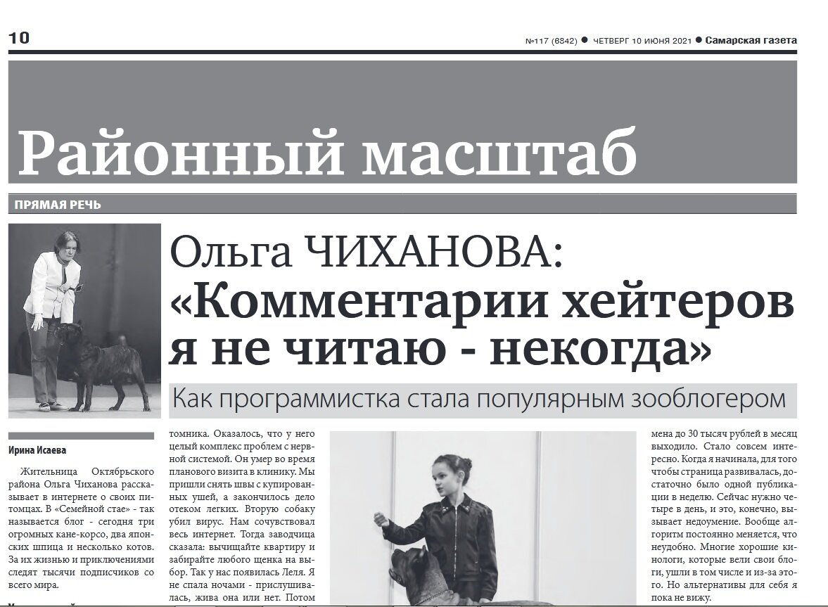 И что с того, что газета местная, самарская. Так и называется "Самарская газета". Ну не печатный международный монстр с многотысячными тиражами, ну и что. Все равно это средство массовой информации (СМИ), не просто так. Мне в первое время после создания канала, точнее, как только появились комментарии, некоторые читатели любили попенять: ай-ай-ай, как же вы так, СМИ, а пишете всякую ерунду. Устала им объяснять, что СМИ и канал на Дзене - это две большие разницы. Даже если у канала много читателей и подписчиков, да хоть миллионы, СМИ он при этом не станет. Ладно потом дзеновские каналы официально переименовали в личные блоги, каковыми большинство из них, по сути, и является. Легче стало объяснять требовательным читателям, почему авторы могут писать практически все что им, авторам, пожелается, ограничиваясь лишь правилами Дзена и больше ничем. Ну это так, небольшое отступление. Значит, я про газету. Позвонила мне журналистка Ирина Исаева и предложила написать про нашу стаю и наш канал.