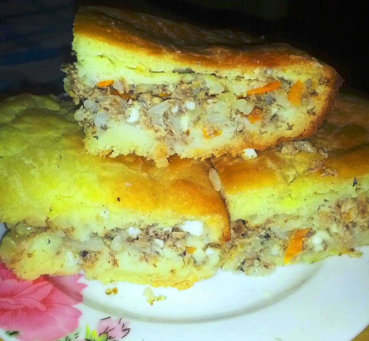 всем привет сегодня мы готовим заливной пирог с рыбной начинкой рецепт очень простой быстро готовится, очень вкусный, получается понадобится мне для теста 3 яйца 1 стакан майонеза 1 стакан сметаны соль сода мука я беру 250 грамм при необходимости можно немножко подсыпать для начинки рыбные консервы я взял сайру, можно взять любые, какие у вас есть доступны вам, лук картошка во вкус в общем 2 3 штучки и это он все ингредиенты, будем смешивать сметану, сюда же разбиваем яйца сода и соль по пол одной чайной ложечки все перемешано теперь просеиваем муку замешиваем вот такое тесто должно получиться как консистенции густой сметаны рыбку но нужно размять вилочкой лук нарезаем желательно помельче и потоньше, сразу же добавляем к рыбе лук разминаем вилочкой и перемешиваем с рыбками картошку натираем на терке готовим форму смазываем ее растительным маслом духовку включаем заранее прогреваем доу 180 градусов выливаем форму половину теста разравниваю первым слоем выкладываем карто