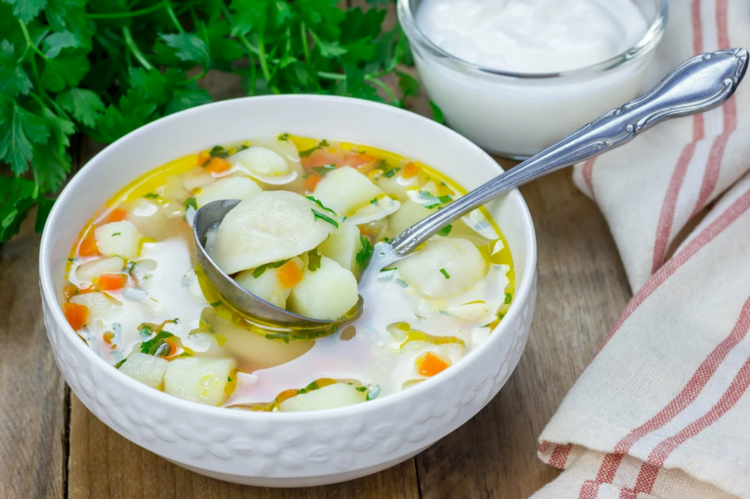 В кастрюлю вливаем воду, доводим до кипения, добавляем перец горошек, лавровый лист, нарезанный картофель, варим до готовности на среднем огне. Потом в разогретую сковороду добавляем масло для жарки, нарезанный лук, натертую морковь и обжариваем в течение 10 минут (до золотистого цвета) периодически помешивая. Как картофель приготовиться, в кастрюлю добавляем замороженные пельмени, соль, специи и готовим 5-7 минут (как всплывут), переносим зажарку и варим на медленном огне ещё 5 минут. Можно дать настояться. Переливаем в тарелку, можно добавить зелень Приятного аппетита!