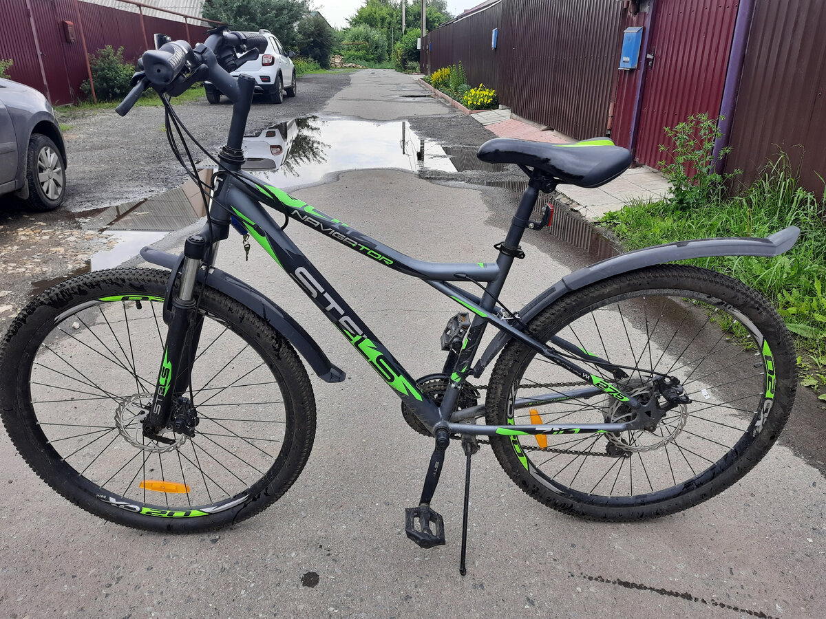 На велоскладе на окраине города озвучила свои требования. Продавец повел меня что-то показывать. Краем глаза увидела велосипед. Нет, не голубой. Черно-серый, с зелеными вставками, с большим количеством звездочек (21 скорость), с 27,5 дюймовыми колесами, амортизационная вилка, дисковые тормоза. Stels Navigator. Понравился сразу. Примерила, не ударилась. Вспомнила, что марку хвалят, в линейке недорогих эти велосипеды считаются надежными, производятся в России. Интересно, что продавец предлагал все что угодно, только не его, я сама подошла к Стелсу, как будто меня притянуло. Уверена, что эти велосипеды пользуются популярностью, поэтому его не впаривали, и так возьмут. Продавец запросил двадцать тысяч, но за мои красивые глаза сбросил тысячу. На том и сошлись.