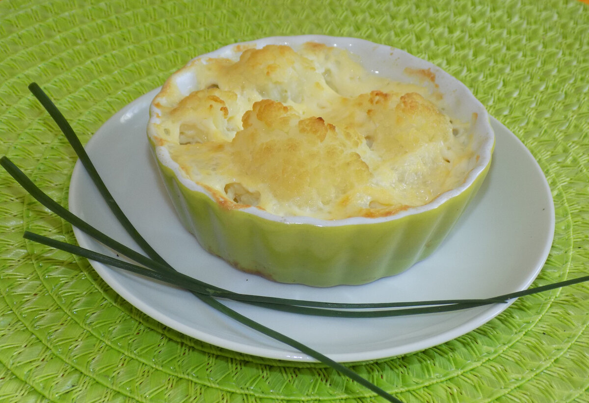 Ингредиенты 1 маленькая цветная капуста 2 стакана молока 1 яйцо Приготовление Цветную капусту разобрать на соцветия и 3 мин отварить в соленой воде. Натрите маленькие миски маслом и разделите на них соцветия цветной капусты. Молоко взбейте с яйцом и солью и залейте смесью цветную капусту. Ставим в разогретую духовку и выпекаем при температуре 170 ° C, пока поверхность не станет золотистой, около 30 минут. Сразу же подавайте, посыпав зеленым луком и зеленью.